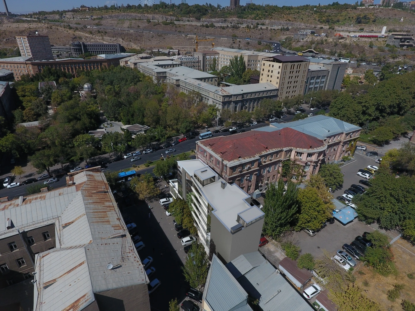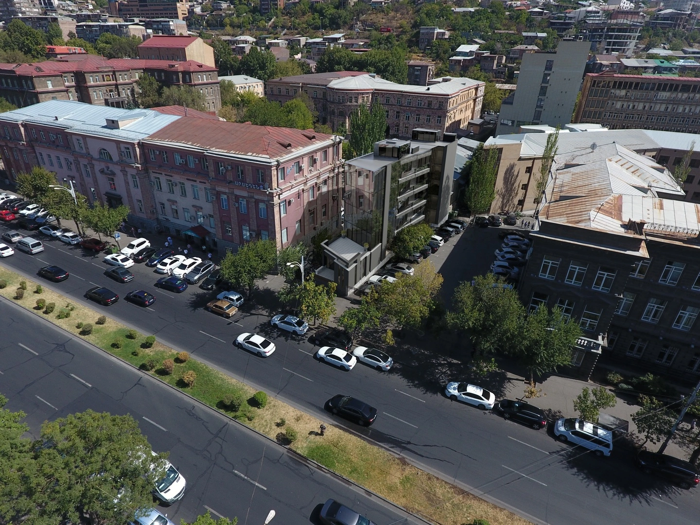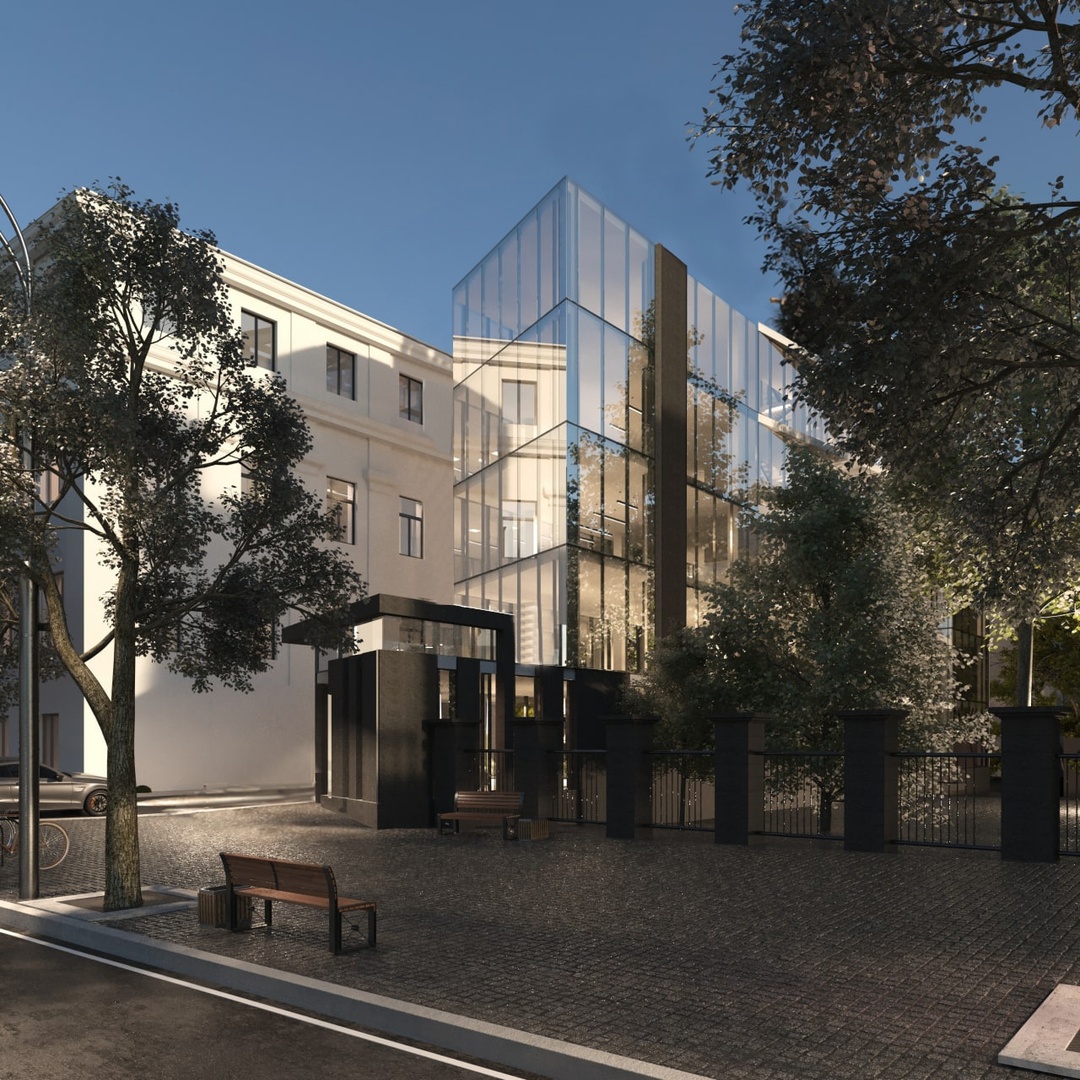 The building consists of one basement and five above-ground floors, with a floor-to-floor height of 3.30 m. The main volume is set back from the street to preserve the visibility of the adjacent historic building, while the first floor follows the building line. The structure is designed as a monolithic reinforced concrete frame with flat roofing and external drainage. The façades feature curtain glazing, ventilated natural tuff stone cladding, basalt plinth slabs, and architectural concrete elements.