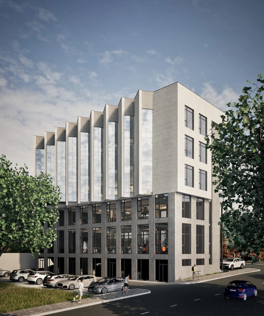 The 0.22 ha land plot accommodates a building with five above-ground floors and one semi-basement level, with a maximum height of 22.95 m. The main volume consists of open-plan office spaces and a showroom.
