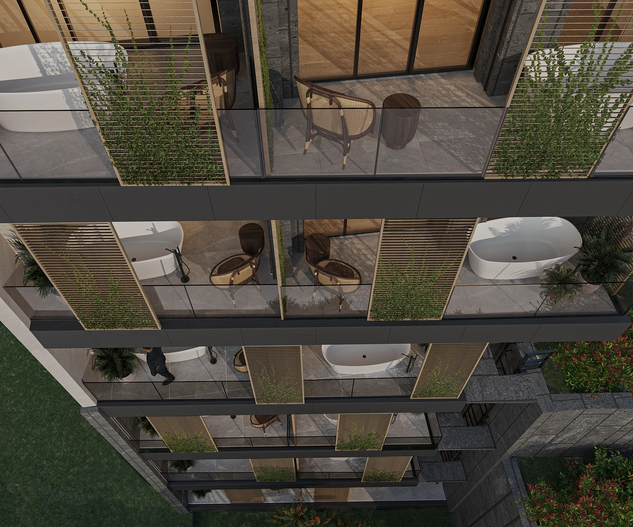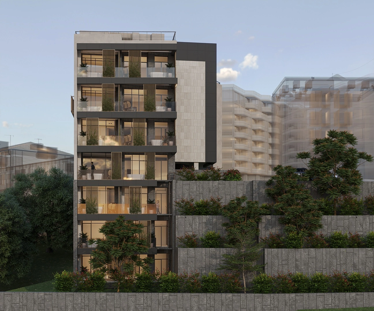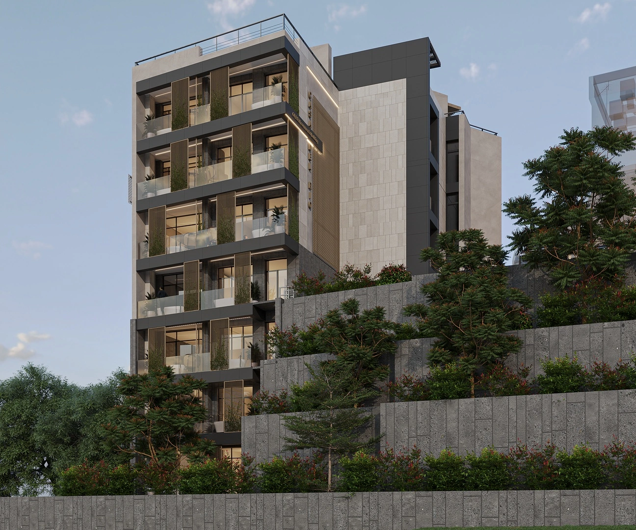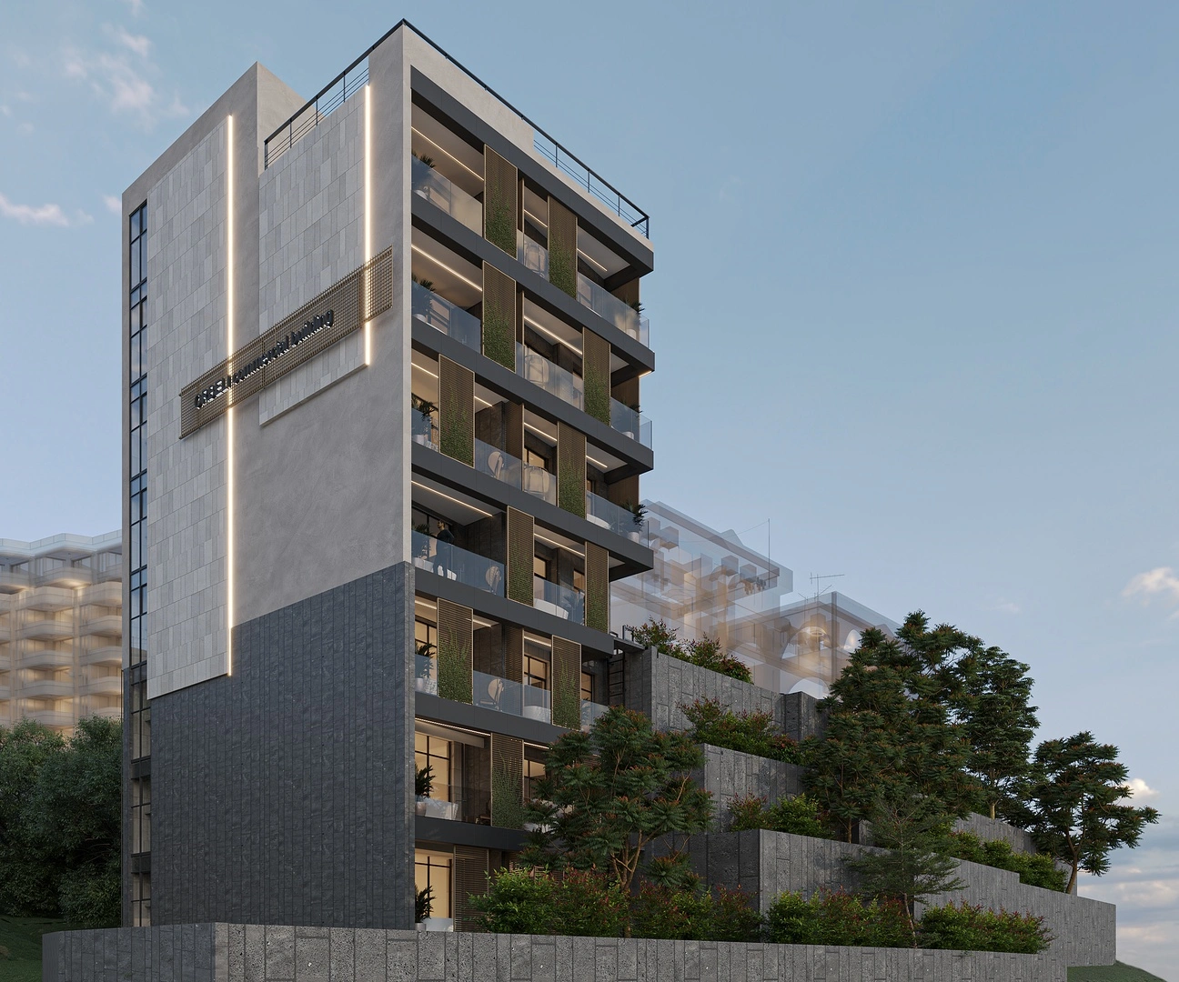 The proposed public building is located at 57/7 Orbeli Brothers Street in the district. It consists of three semi-basement levels and four above-ground floors. The semi-basement levels include office spaces, a spa area, and a pump station, while the upper floors are designated for offices. The building is designed as a monolithic reinforced concrete frame with a flat roof and internal drainage. The façade will feature ceramic granite tiles, high-quality plaster, wooden pergolas, and metal mesh.
