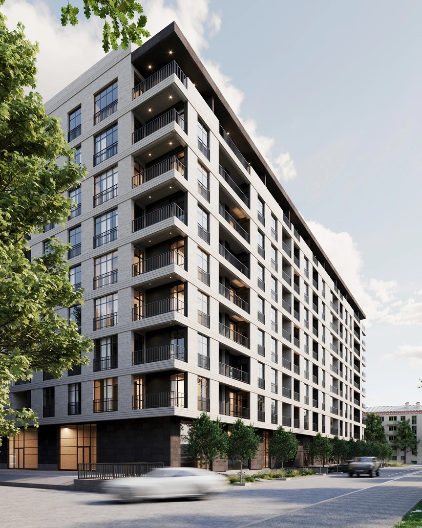 The P-shaped building consists of 4 entrances, each with an elevator and stairwell. It includes 1 underground and 9 above-ground floors.